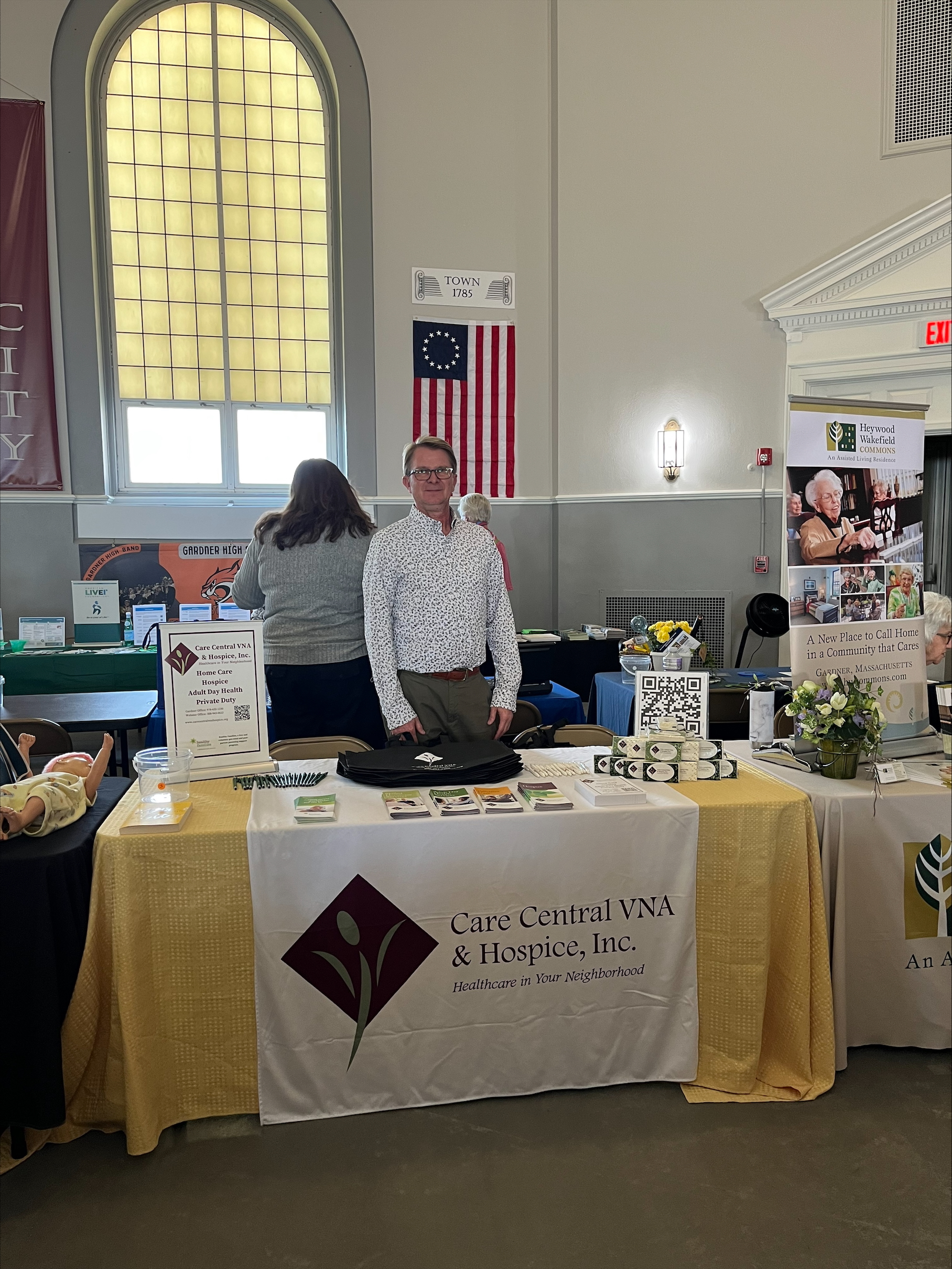 Last week, Community Liaisons Richard Eastham and Terri Saveall were busy at several community events, promoting all Care Central VNA & Hospice, Inc. services and programs. Pictured: Richard Eastham at the Greater Gardner Health and Wellness Fair at City Hall, Rich with Bill Connnors of Life Care Centers of America at the Winchendon Senior Center and Terri Saveall at the Senior Care Collaboration meeting held at The Gables in Fitchburg, MA with guest speaker Donna Bartlett.